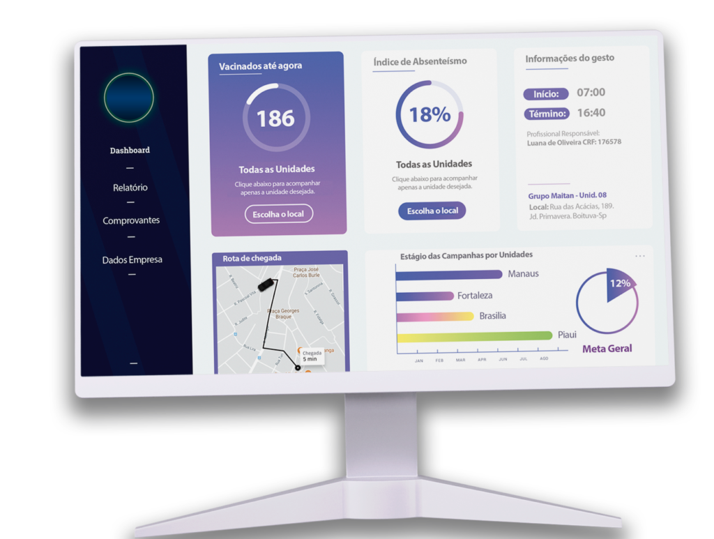 Acompanhe a rota de chegada da equipe de vacinação em cada localidade, monitore a evolução do número de vacinados ao longo do dia, os índices de faltas e tenha acesso aos comprovantes vacinais e relatórios imediatamente após o término da tarefa.